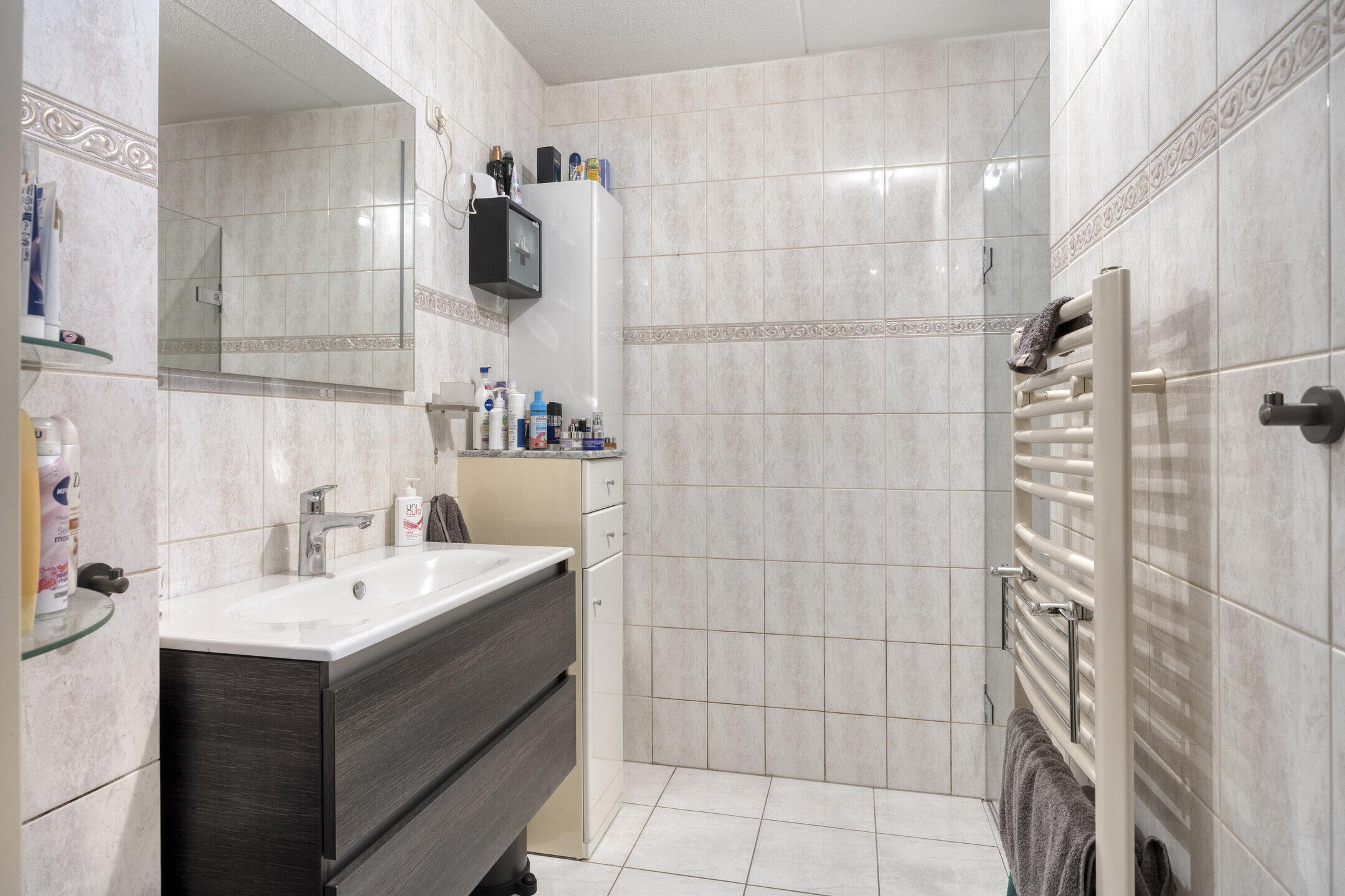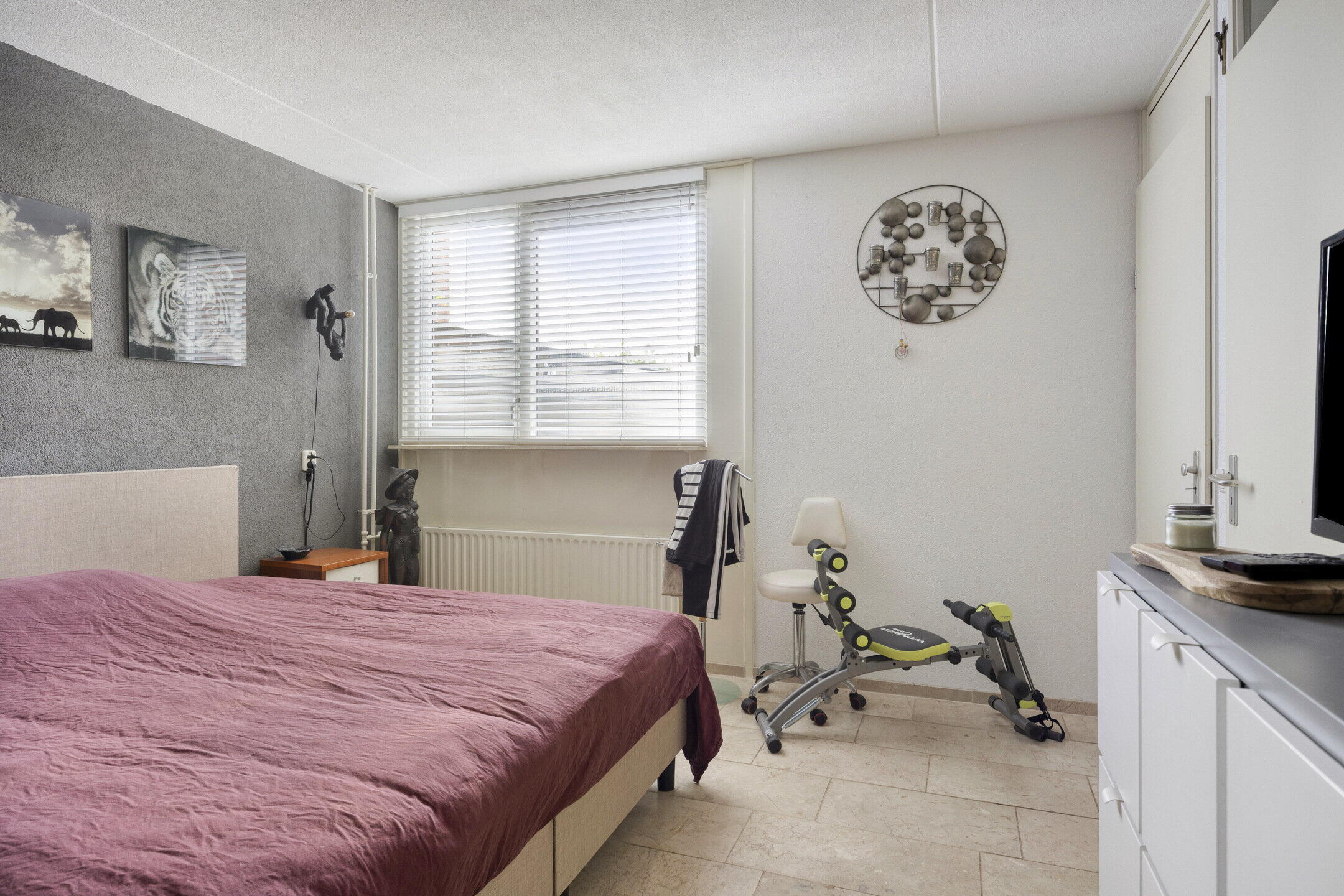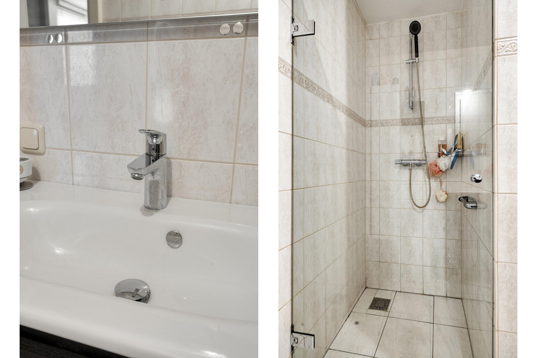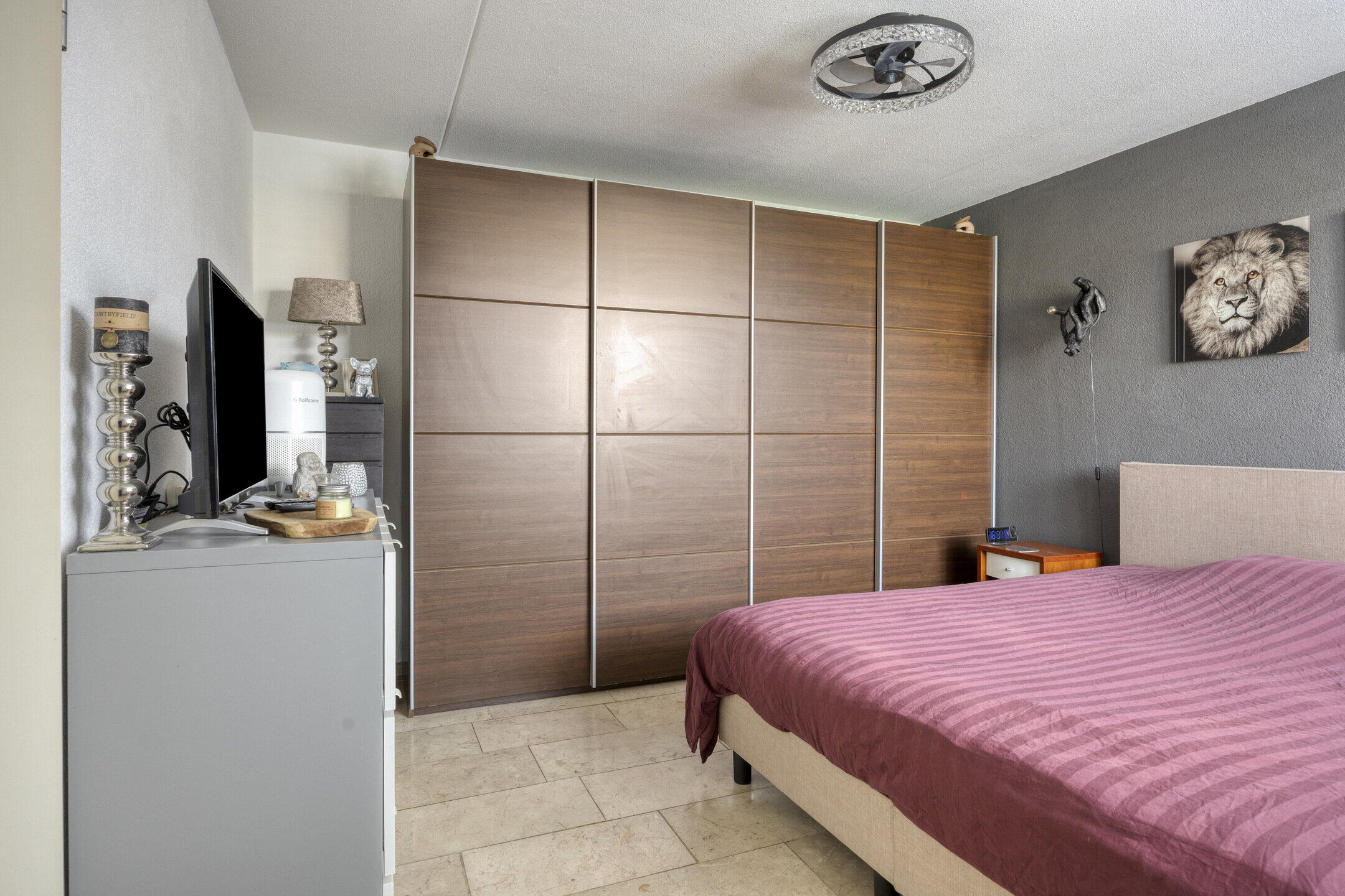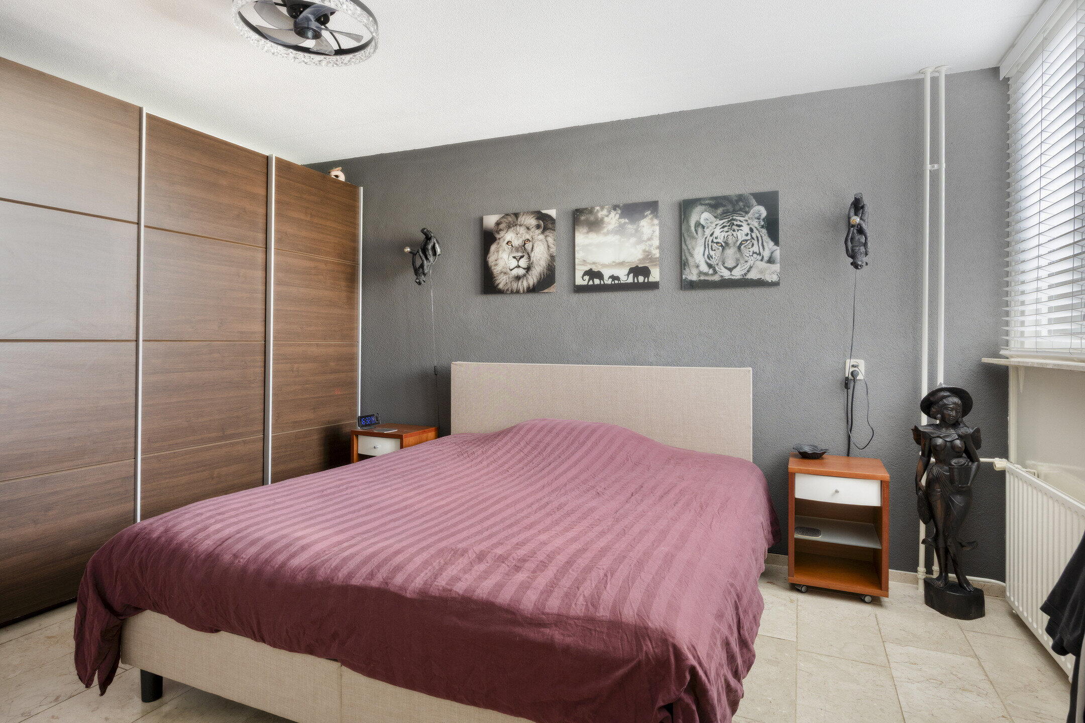 Aan de achterzijde van de woning bevindt zich de royale slaapkamer op de begane grond. Deze kamer biedt voldoende ruimte voor een groot tweepersoonsbed en een ruime kledingkast. De praktische trapkast zorgt daarnaast voor extra bergruimte. De badkamer is voorzien van een douche, wastafelmeubel, designradiator en mechanische ventilatie.