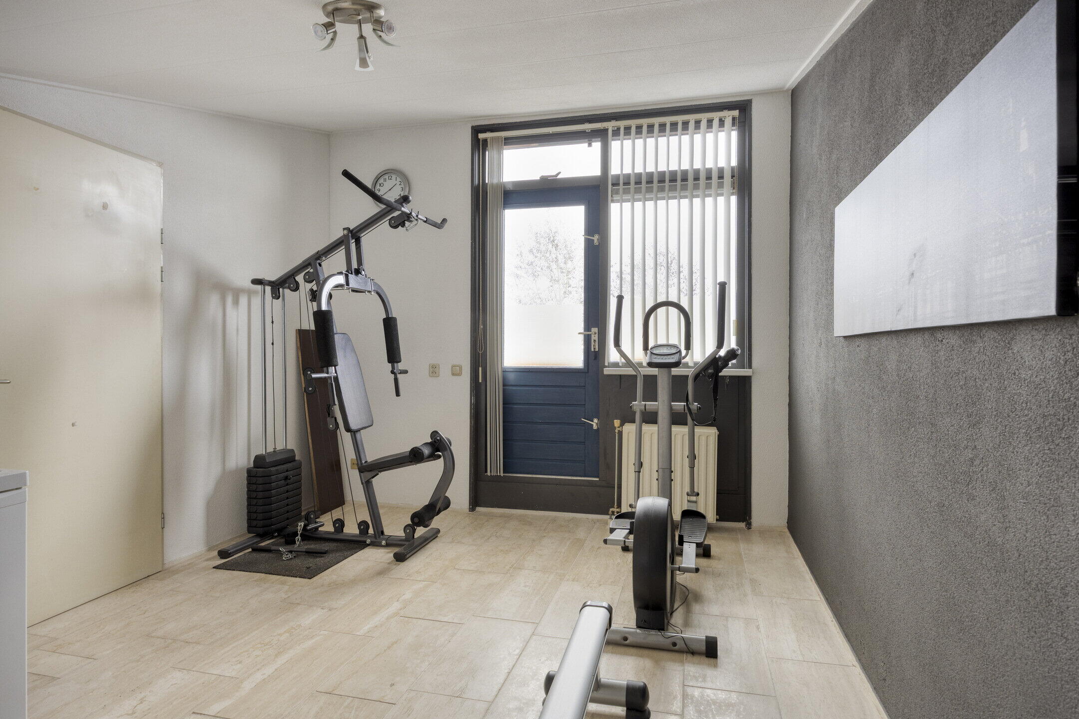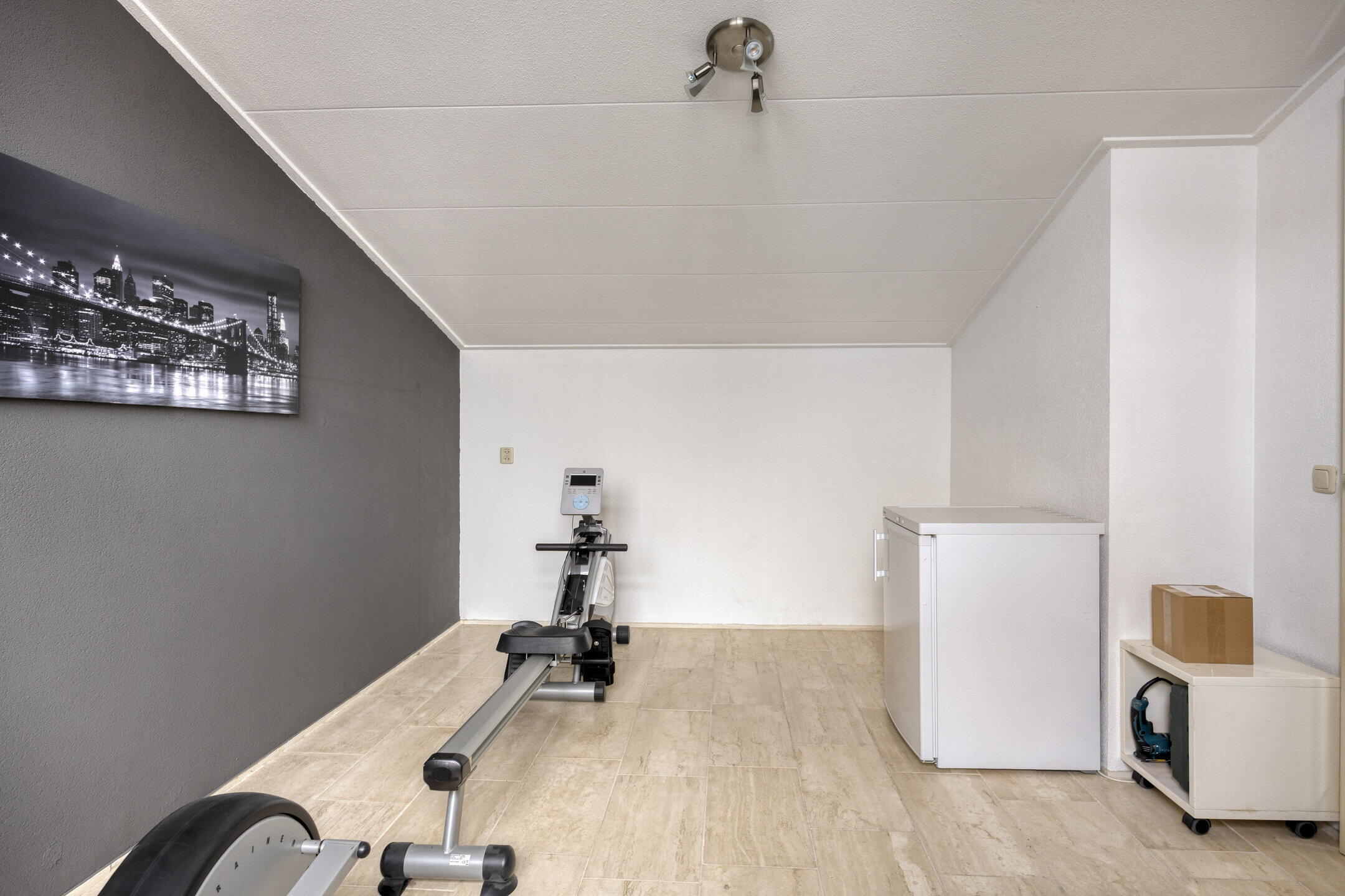 Via de trap bereikt u de overloop op de eerste verdieping. Hier bevindt zich een tweede inpandige berging. Daarnaast is er een tweede slaapkamer, momenteel in gebruik als sportruimte. Deze kamer is ook uitstekend geschikt als logeerkamer, hobbyruimte of werkplek. Vanuit deze kamer is er toegang tot het royale dakterras. Het dakterras is een absolute meerwaarde: een riant buitenverblijf met vrij uitzicht over het groen en de speeltuin. Dankzij het royale formaat vindt u hier altijd een fijne plek in de zon of juist in de schaduw.