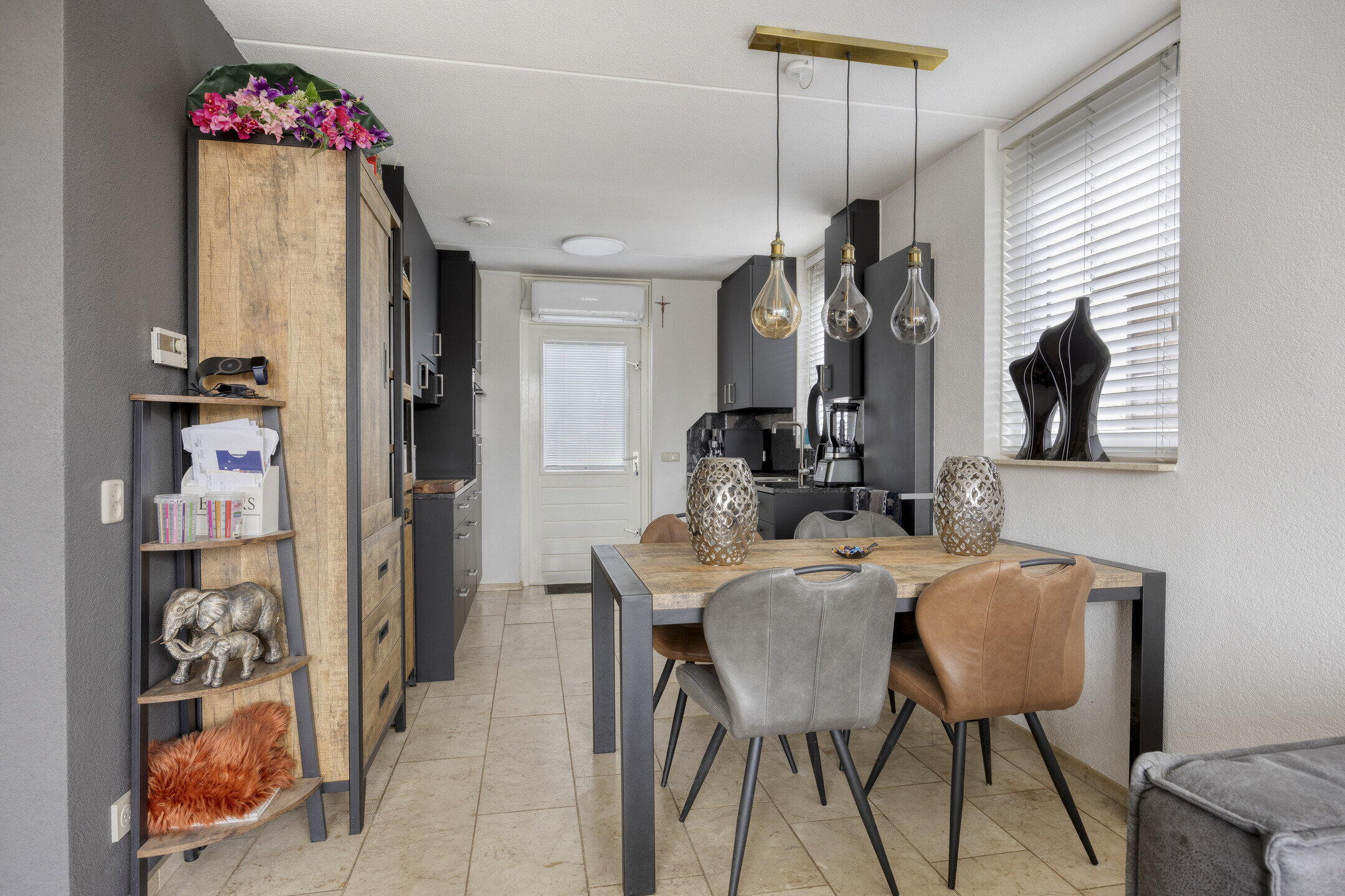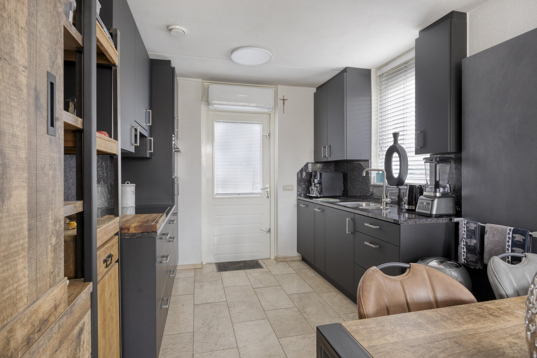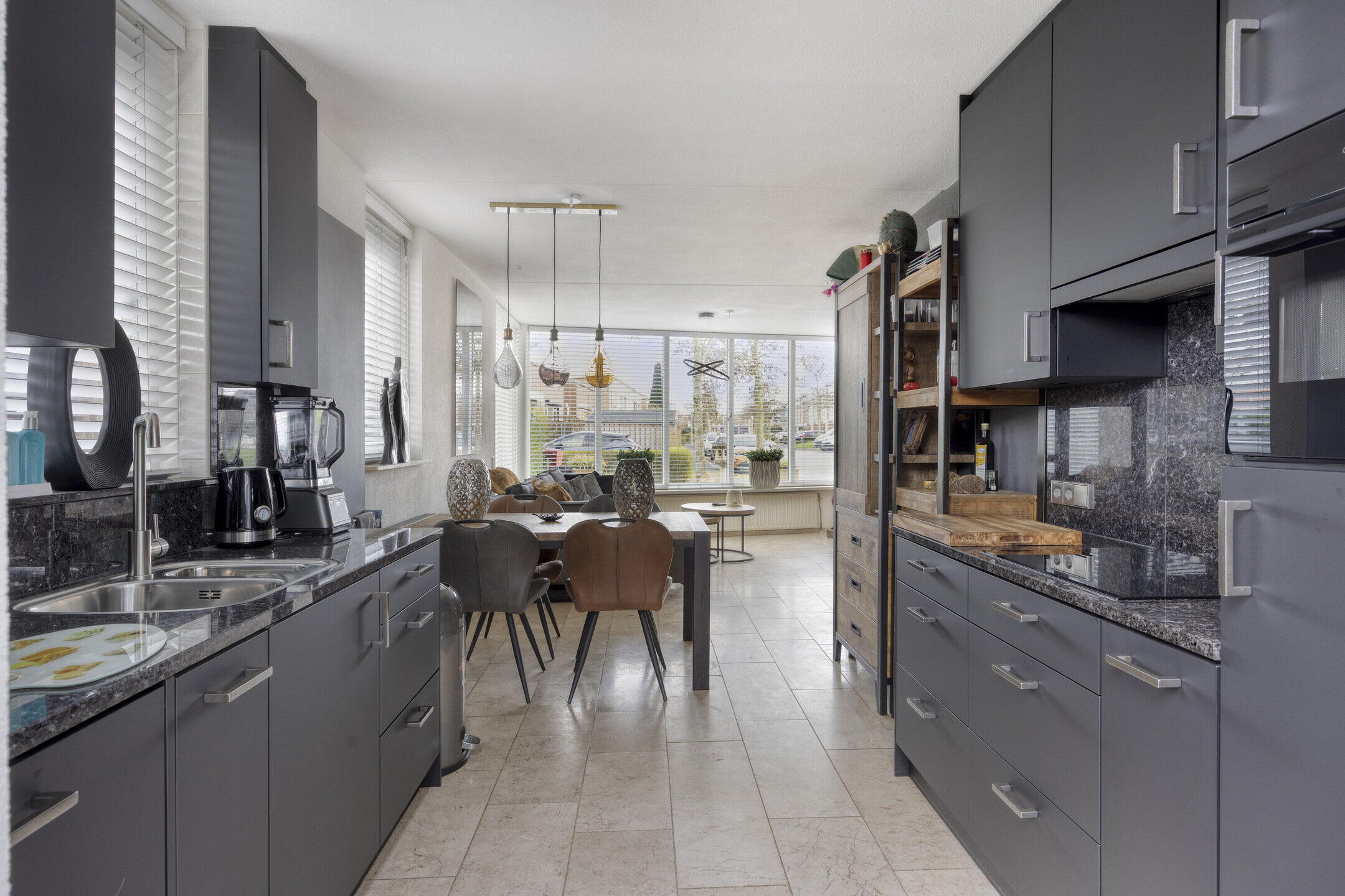 Aan de voorzijde bevindt zich de woonkamer. Het vele glas zorgt voor een prachtige lichtinval. De open keuken is in 2023 vernieuwd en uitgevoerd in een stijlvolle matzwarte opstelling. De keuken is voorzien van diverse inbouwapparatuur, waaronder een combi-oven, vlakscherm afzuigkap, inductiekookplaat, koelkast en vaatwasser. Vanuit de keuken is er een directe deur naar het terras en de tuin.