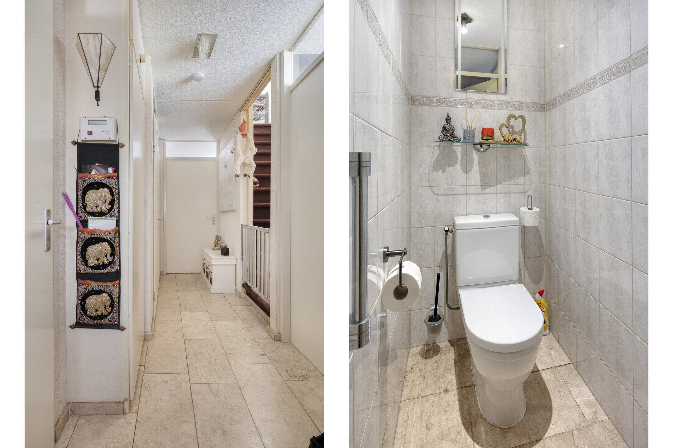 Via de voortuin met eigen oprit bereikt u de overdekte entree van de woning. In de hal bevinden zich de meterkast, een nette toiletruimte en de trapopgang naar de verdieping.